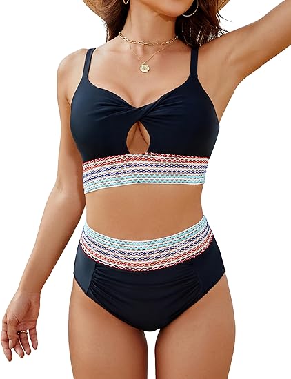 Womens High Waisted Bikini Sets Tummy Control Bathing Suit Color Block Swimsuits Twist Two Piece Swim Suits