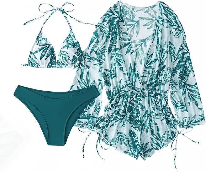 Women's 3 Piece Swimsuits Tropical Print Bikini Set Halter Drawstring Side Bathing Suits with Cover Up