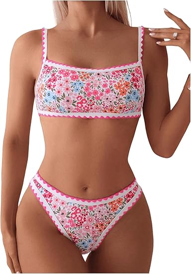 Women's 2 Piece Floral Print Swimsuit Triangle String High Cut Bikini Sets Bathing Suit